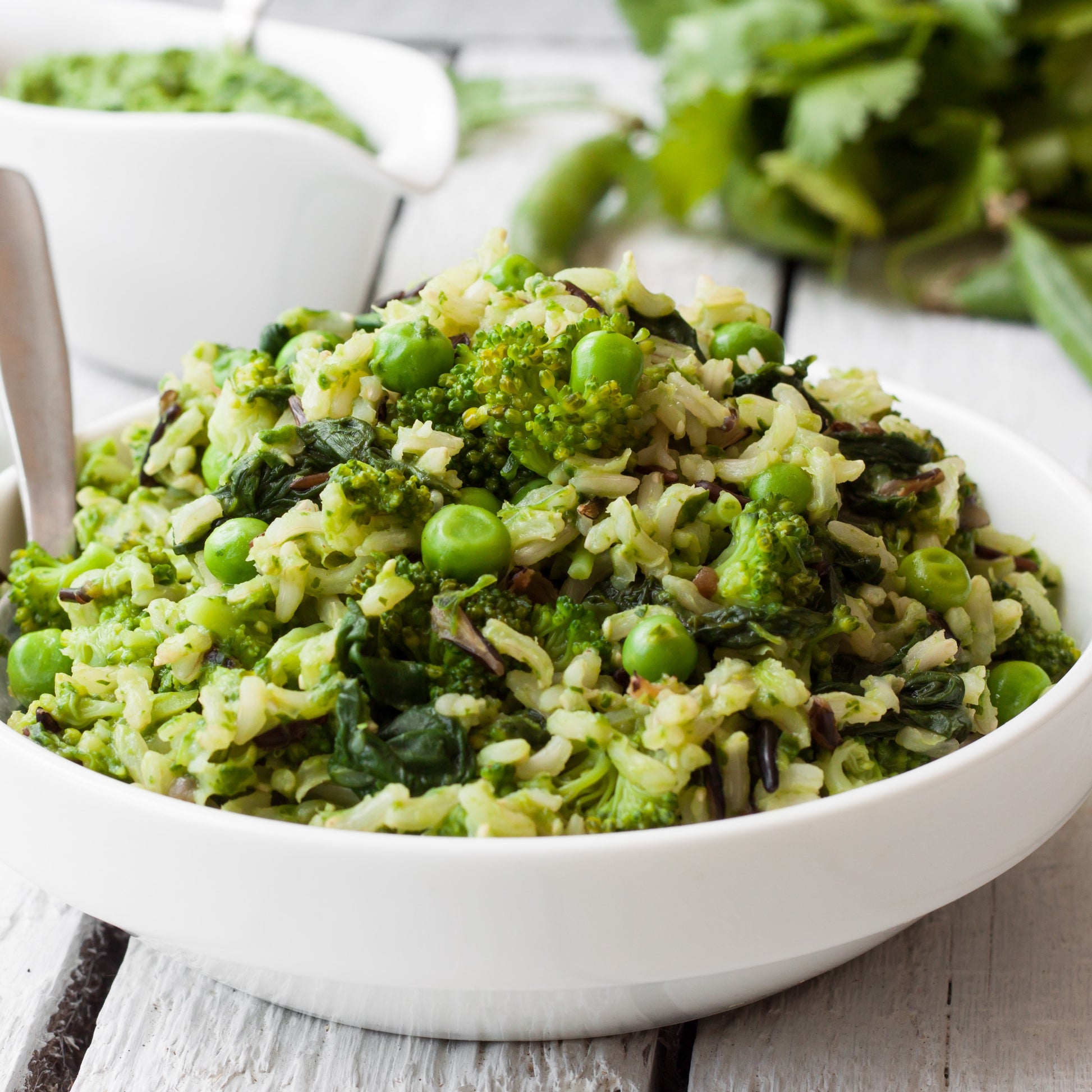 Steamed Cauliflower & Broccoli in a creamy White Sauce served with Long-grain Rice & Peas.