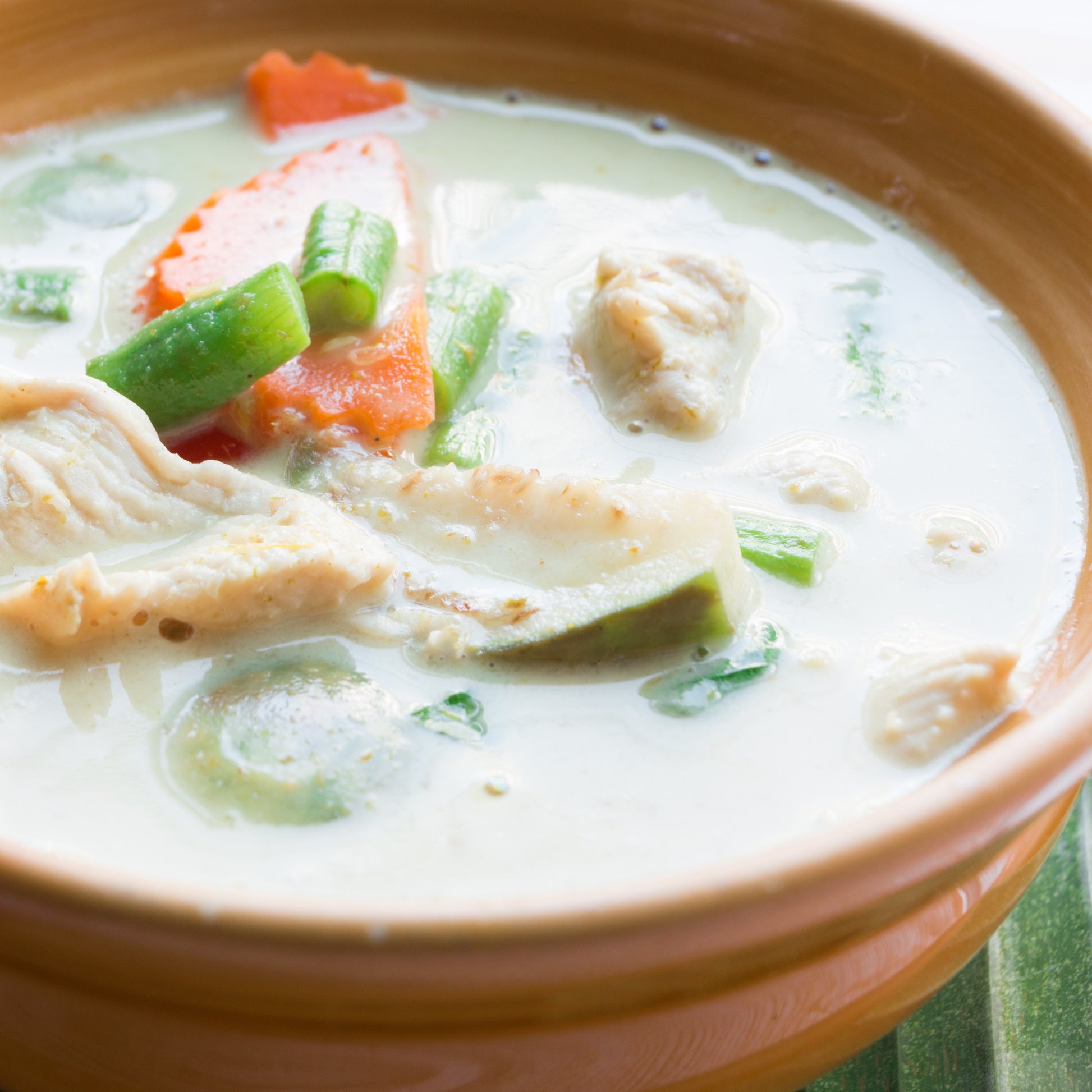 Free-range Chicken Breast poached in Coconut broth with Carrots, Peas & Sweet Potato, served on Brown Rice.