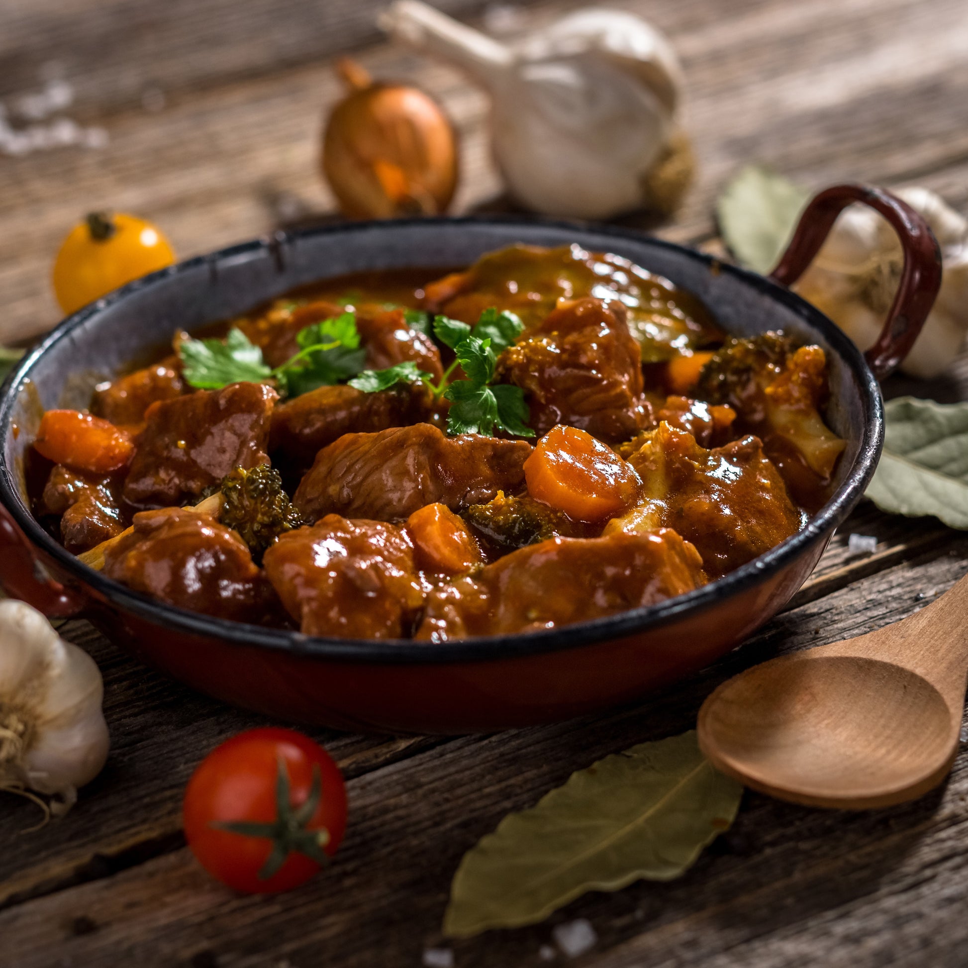 Slow-cooked Lamb in smokey Tomato Sauce with Butternut, Carrots, Sweet Potato, Fresh Tomatoes & Onions.